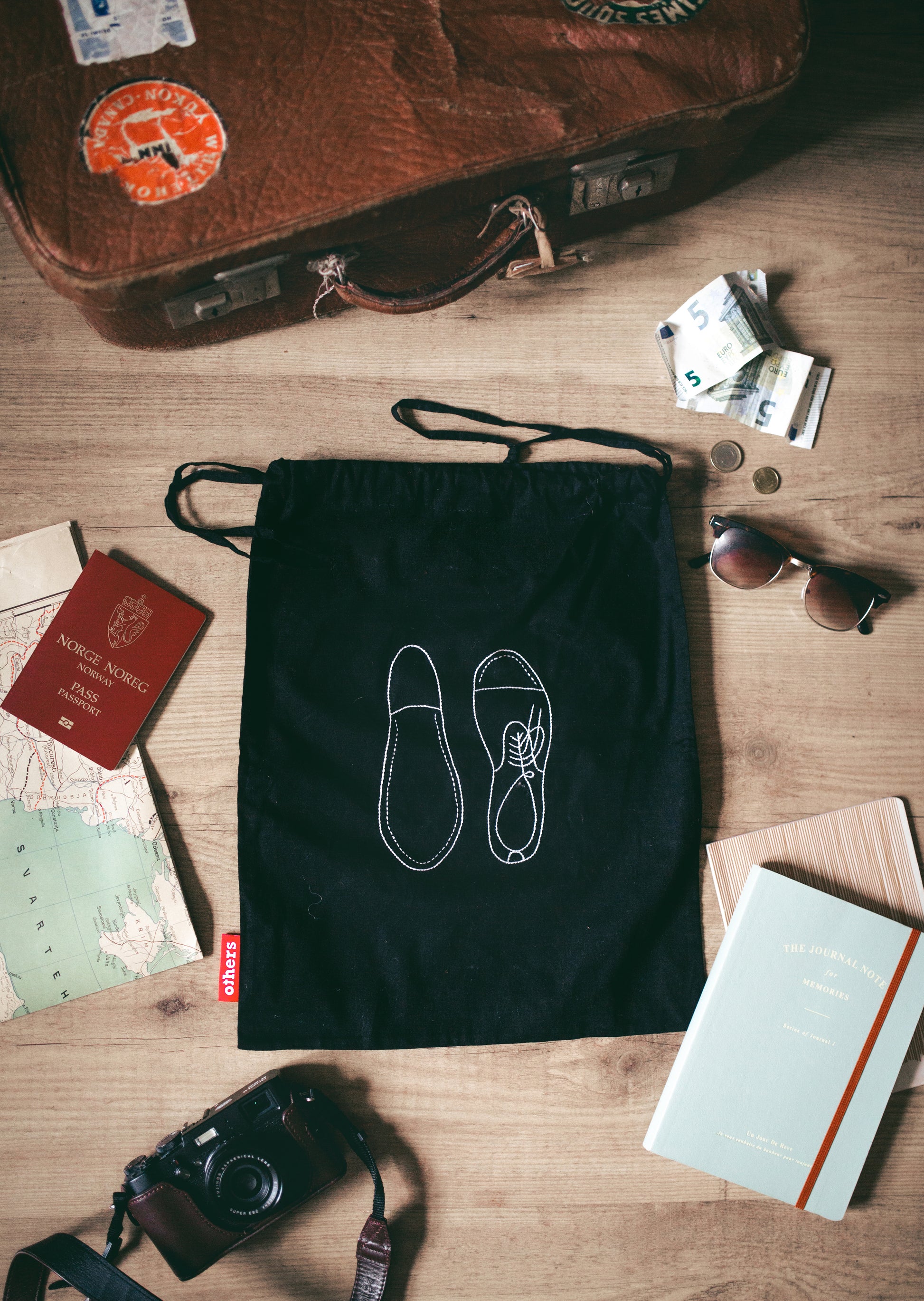 Útsaumaður skópoki úr 100% bómull. Frábær til að hafa með á ferðalögum, til að geyma spariskó, taka með sér auka skó í vinnuna, halda skipulagi í ferðatöskunni eða til að taka spariskóna með í veislu. Pokinn rúmar auðveldlega tvö skópör í stærðum 36-43.